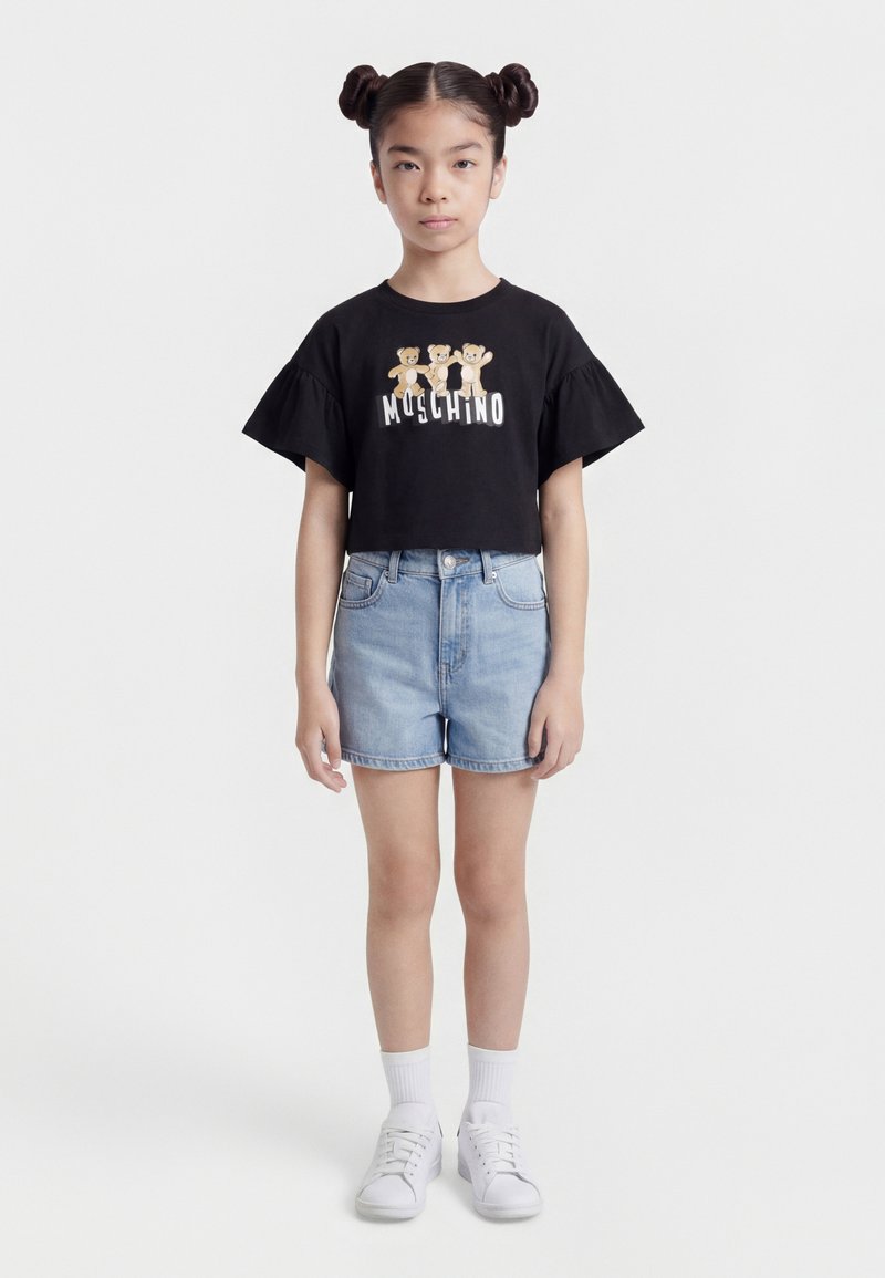 Μαύρο crop-top μπλουζάκι με κοντά μανίκια με βολάν, διακοσμημένο με τρεις μπεζ αρκουδάκια που στέκονται πάνω από το λευκό όνομα της μάρκας "MOSCHINO" στο μπροστινό μέρος.
