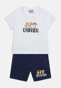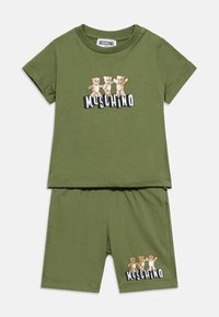Σετ για νήπια σε ελιά πράσινο χρώμα με κοντά μανίκια και σορτς, με τρία μπεζ αρκουδάκια και το κείμενο "Moschino" στο πάνω μέρος και στο σορτς.
