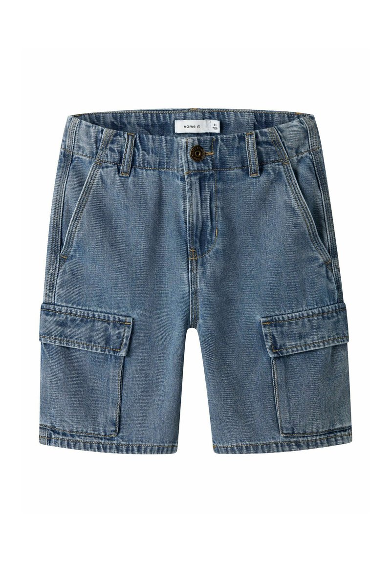 Μπλε τζιν cargo σορτς για παιδιά με κουμπί στο μπροστινό μέρος, θηλιές για ζώνη, πλαϊνές τσέπες και τσέπες με καπάκι σε κάθε πόδι.