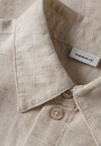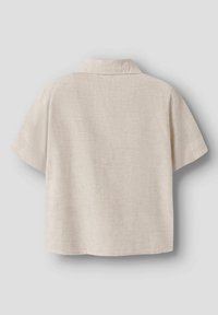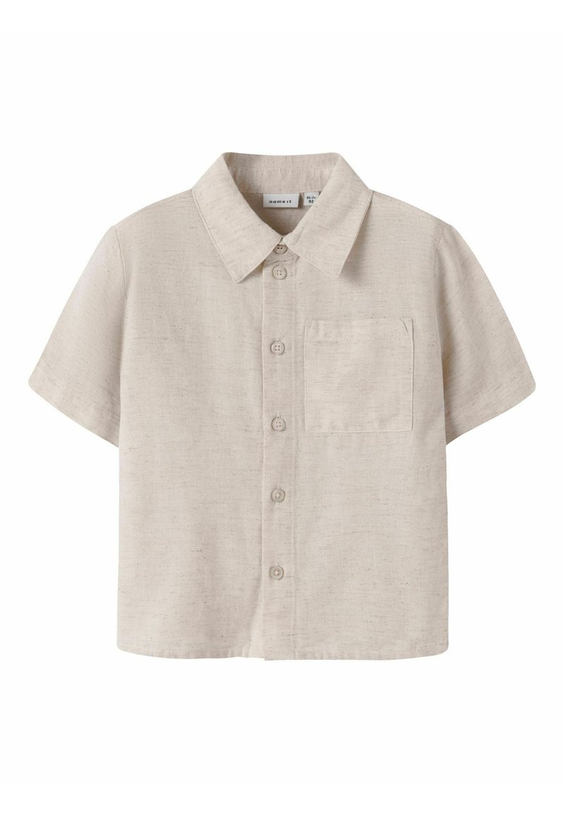 Μπέζ κοντομάνικο πουκάμισο με κουμπιά και γιακά, με μία μόνο τσέπη στο στήθος, φτιαγμένο από υφασμένο ύφασμα.