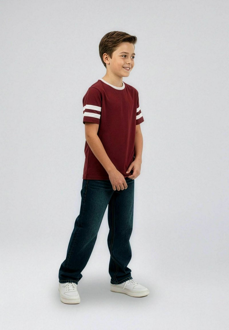 Μπορντό μπλούζα με κοντά μανίκια με λευκές ρίγες, σε συνδυασμό με σκούρο μπλε τζιν και λευκά αθλητικά παπούτσια. Το μοντέλο στέκεται σε ουδέτερο φόντο.