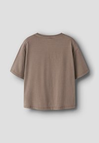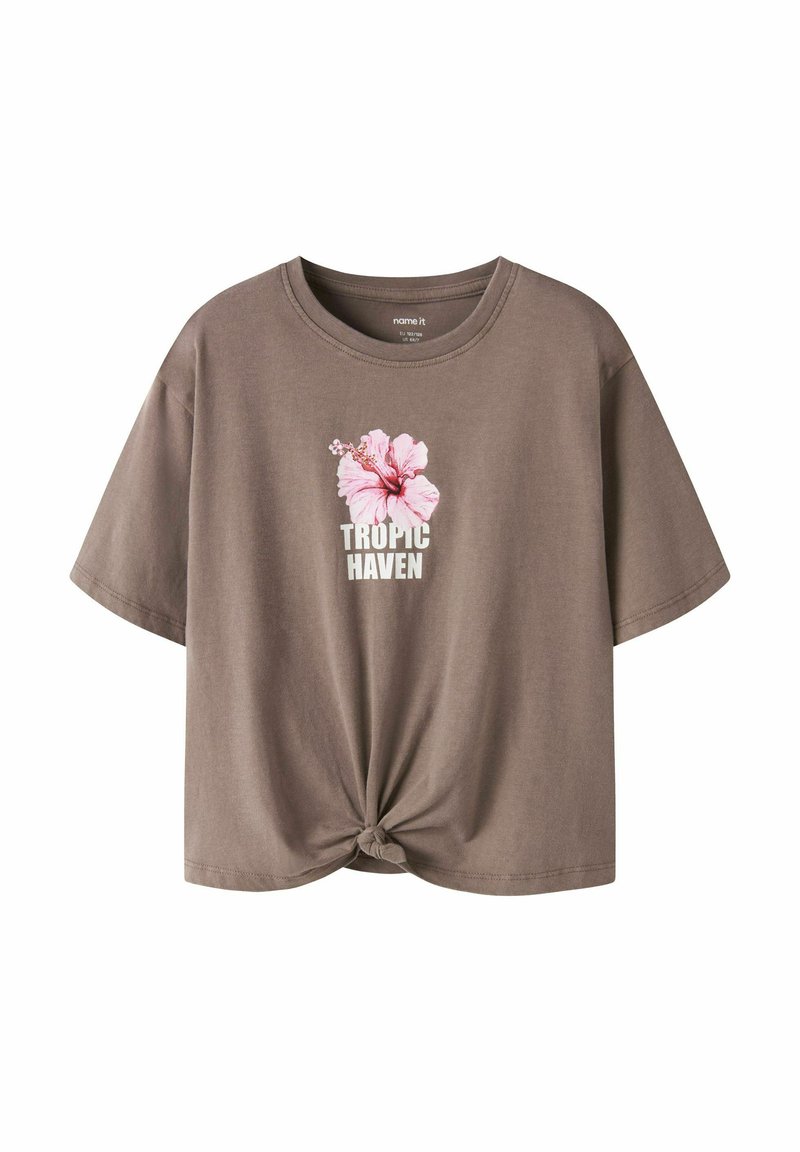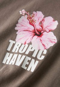 Καφέ κοντομάνικη μπλούζα με κόμπο μπροστά, γραφικό ροζ άνθος ιβίσκου και λευκό κείμενο "TROPIC HAVEN" στο κέντρο του στήθους.
