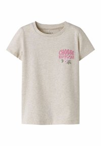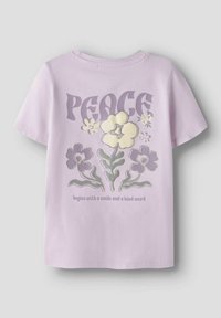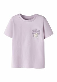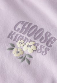 Ανοιχτό μωβ κοντομάνικο T-shirt με το κείμενο «Επίλεξε Καλοσύνη» και γραφικό λευκού λουλουδιού στο πάνω αριστερό μέρος του στήθους, στρογγυλή λαιμόκοψη.