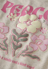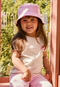 Νεαρή κοπέλα με ροζ καπέλο, μπεζ μπλουζάκι και ροζ παντελόνι κάθεται χαμογελώντας πάνω σε ξύλινο περβάζι σε φωτεινός κήπο.