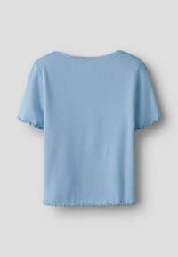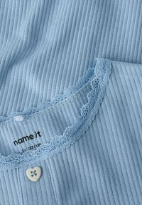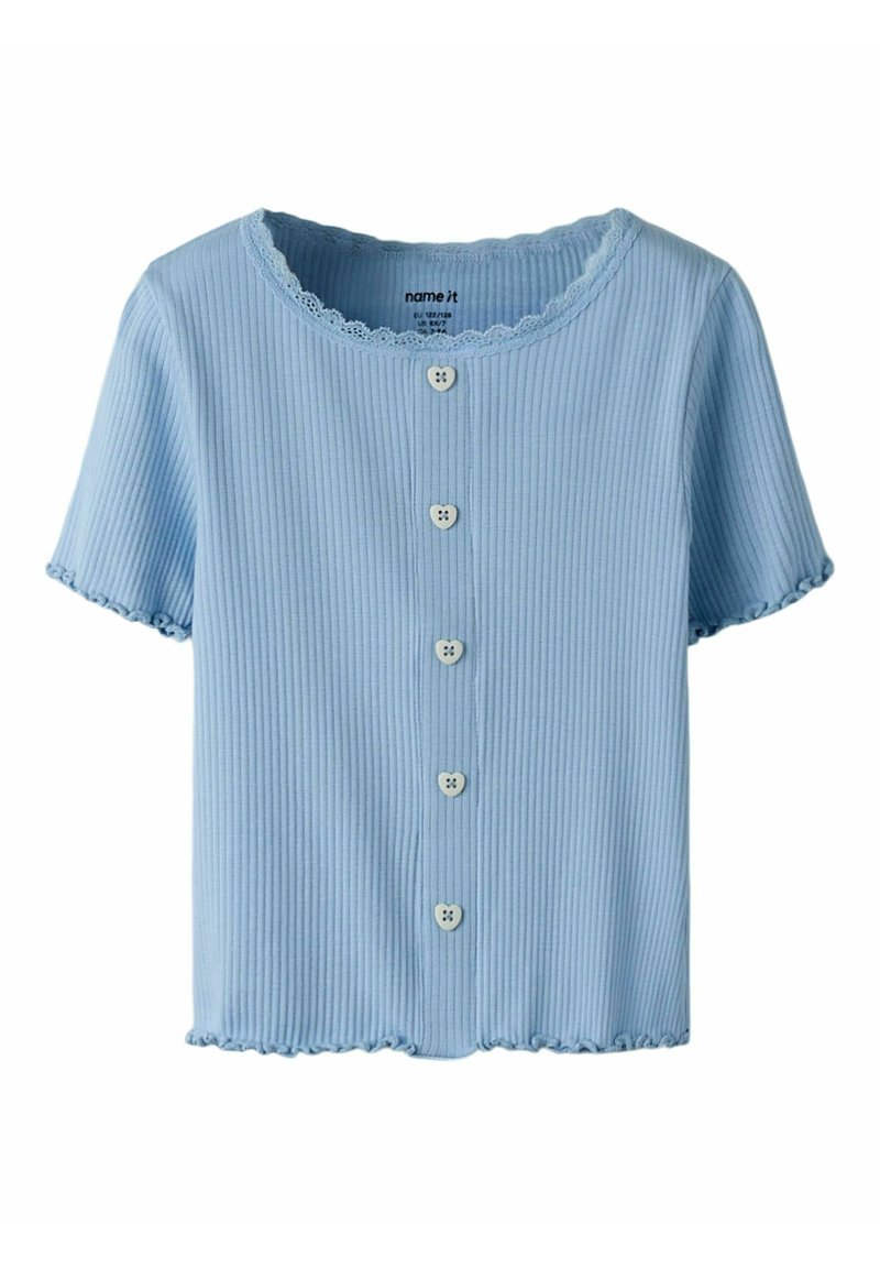 Ανοιχτό μπλε ριμπ κοντομάνικο τοπ με κυματιστά τελειώματα, στρογγυλή λαιμόκοψη και πέντε κουμπιά σε σχήμα καρδιάς κατά μήκος του μπροστινού μέρους.