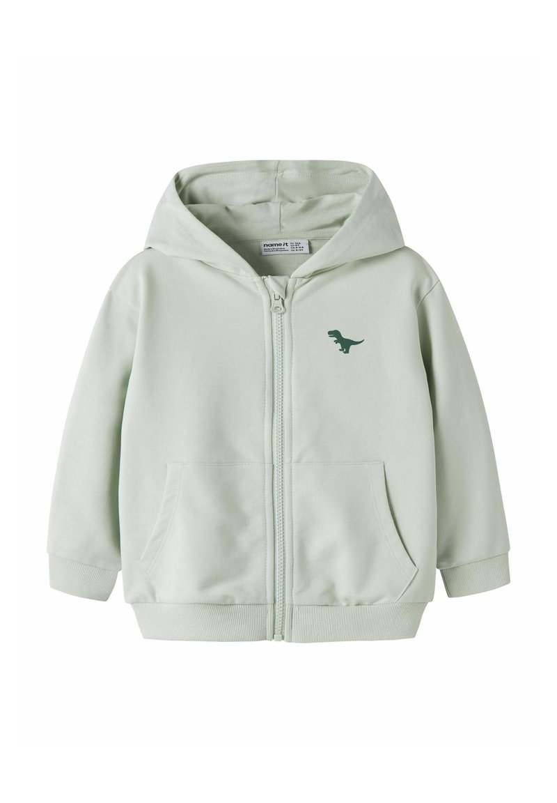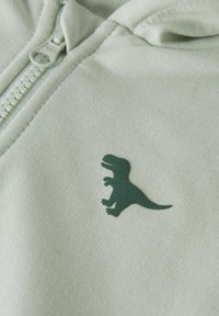 Ανοιχτό γκρι παιδικό φούτερ με φερμουάρ, μπροστινές τσέπες, κουκούλα και μικρό σκούρο πράσινο γραφικό δεινόσαυρου στο αριστερό μέρος του στήθους.