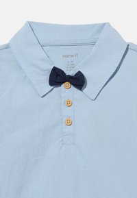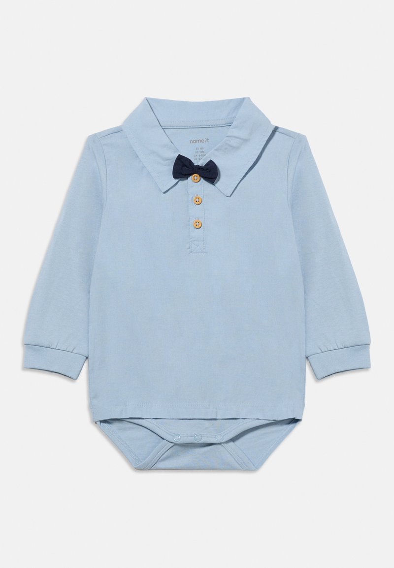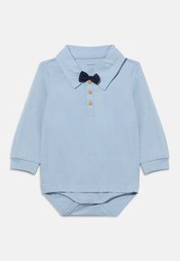 Βαμβακερό βρεφικό κορμάκι με μακριά μανίκια σε ανοιχτό γαλάζιο χρώμα, με γιακά, τρία ξύλινα κουμπιά και προστιθέμενη σκούρα μπλε γραβάτα στον λαιμό.