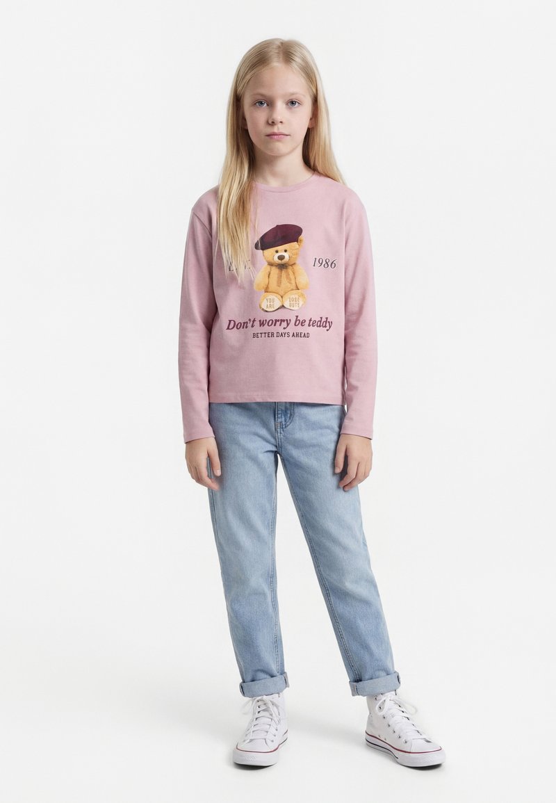 Νεαρή κοπέλα που φοράει ροζ μπλούζα με μακριά μανίκια, με γραφικό αρκουδάκι και κείμενο, ανοιχτό μπλε τζιν και λευκά αθλητικά παπούτσια, σε λευκό φόντο.