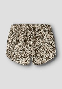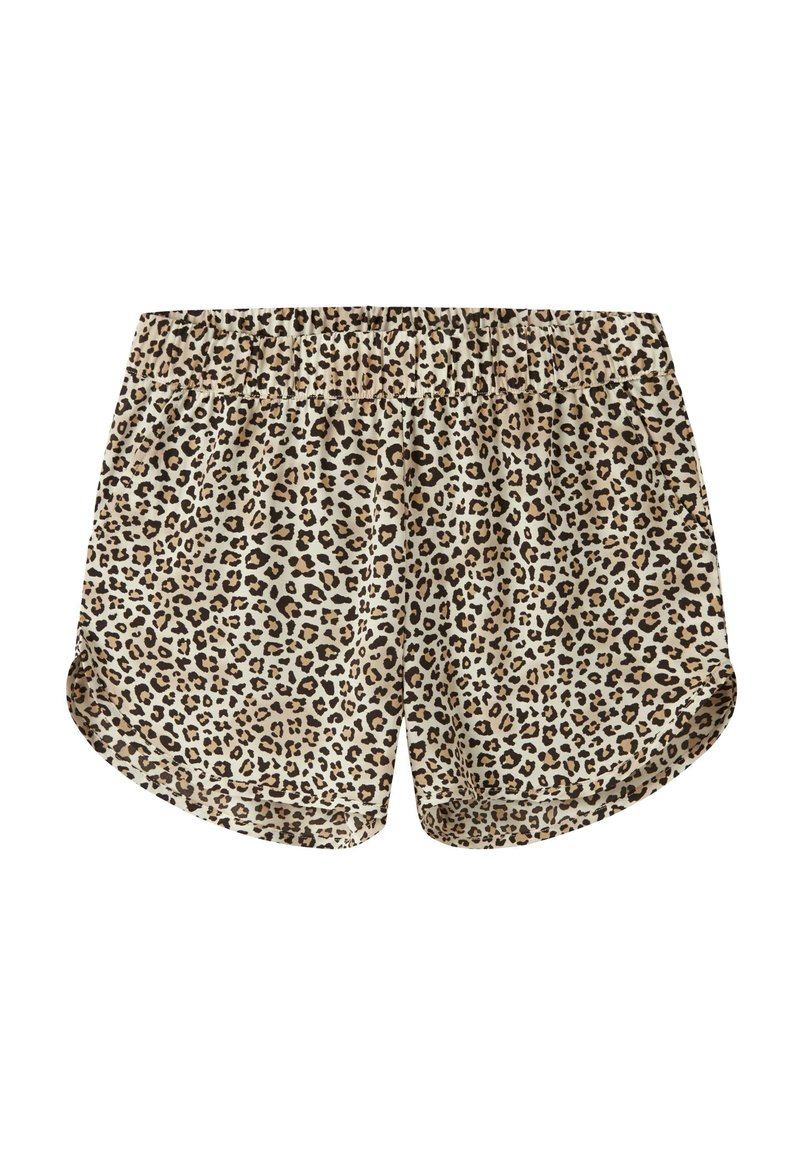 Σορτς με τύπωμα λεοπάρδαλης, ελαστική ζώνη μέσης, μπεζ βάση και σκούρα καφέ στίγματα. Μαλακό ύφασμα με άνετη εφαρμογή και καμπυλωτό τελείωμα.