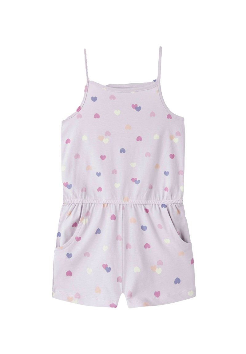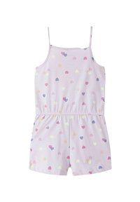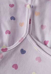 Φόρμα σε ανοιχτό μωβ χρώμα με λεπτές τιράντες, διακοσμημένη με σχέδια καρδιών σε ροζ, μωβ, κίτρινο και ροδακινί χρώμα, και δύο πλαϊνές τσέπες.