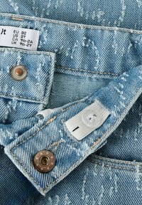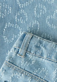 Παντελόνι για μωρά από ανοιχτό μπλε τζιν με ανάγλυφα σχέδια καρδιάς, στυλ με πέντε τσέπες, θηλιές για ζώνη και κλείσιμο με κουμπί στη μέση.