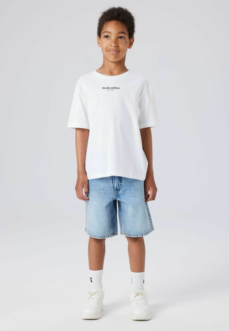 Αγόρι στέκεται με λευκό t-shirt "Studio edition", ανοιχτό μπλε τζιν σορτς, λευκές κάλτσες και λευκά αθλητικά παπούτσια μπροστά σε μονόχρωμο φόντο.