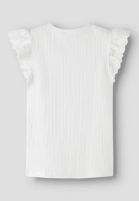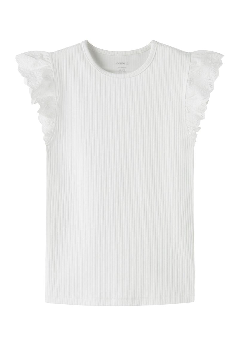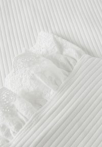 Άσπρο ριμπ αμάνικο τοπ με στρογγυλή λαιμόκοψη και λεπτομέρειες από δαντέλα σε βολάν στους ώμους.