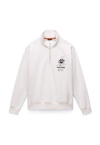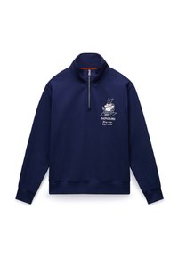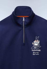 Φούτερ σε ναυτικό μπλε χρώμα με ψηλό γιακά, κλείσιμο με φερμουάρ στο μισό μήκος και γραφικό σχέδιο στο στήθος που απεικονίζει ένα λαγουδάκι και κείμενο. Απαλή υφή.