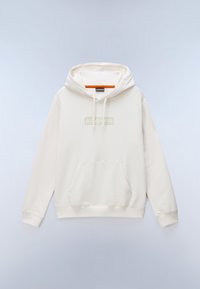 Άσπρο φούτερ με κουκούλα, εμπρόσθια τσέπη και επιγραφή με το λογότυπο "Napapijri Geographic" στο στήθος, απλωμένο επίπεδα πάνω σε ανοιχτό φόντο.