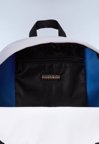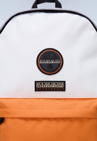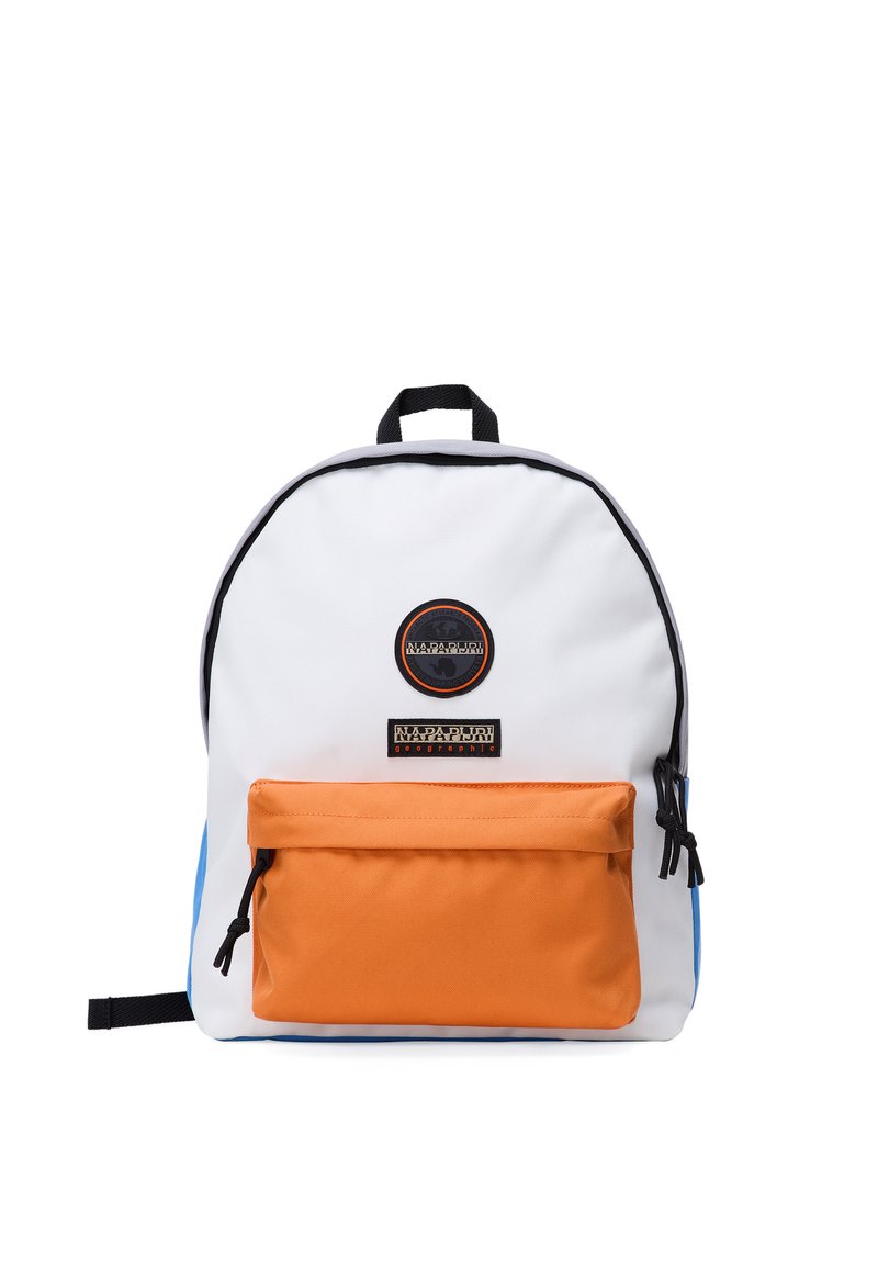 Λευκό σακίδιο με πορτοκαλί μπροστινή τσέπη, μαύρους ρυθμιστές φερμουάρ και κυκλικά και ορθογώνια λογότυπα Napapijri στο μπροστινό μέρος.