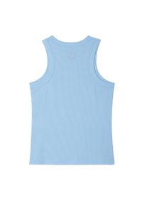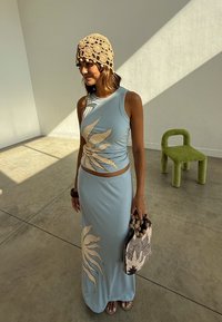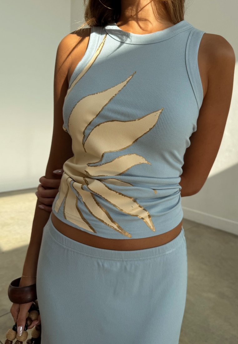 Γυναίκα που φορά μια ανοιχτό μπλε, ριγέ αμάνικη μπλούζα και φούστα με σχέδιο μπεζ φύλλου, κρατώντας τσάντα με χάντρες και ξύλινο βραχιολάκι σε φωτεινό δωμάτιο.