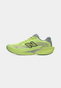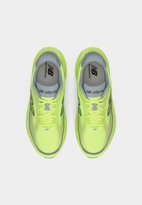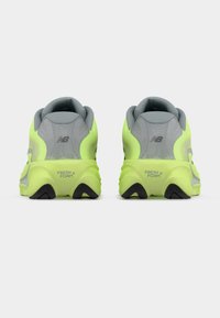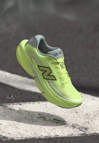 Φωσφοριζέ κίτρινο παπούτσι running της New Balance, αιωρούμενο πάνω από άσφαλτο με λευκές βαμμένες γραμμές και μικρά σκουπίδια από κάτω.