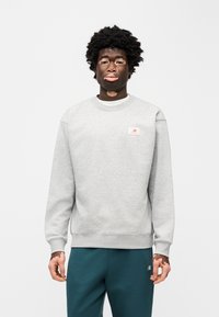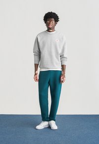 Γκρι φούτερ με στρογγυλή λαιμόκοψη, ριμπ μανσέτες και ένα μικρό κόκκινο και λευκό λογότυπο στο στήθος, συνδυασμένο με τιρκουάζ παντελόνι.