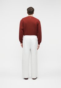 Άνδρας που φοράει ανοιχτό γκρι φαρδιά φόρμα με ρίγες στο πλάι, μια φούτερ σε σκουριά χρώμα και κόκκινα αθλητικά παπούτσια, στέκεται μπροστά σε απλό φόντο.