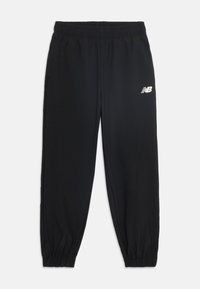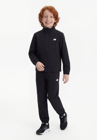 Χαμογελαστό παιδί με κόκκινα μαλλιά, φορώντας μαύρη φόρμα New Balance και μαύρα αθλητικά παπούτσια, στέκεται μπροστά σε λευκό φόντο.