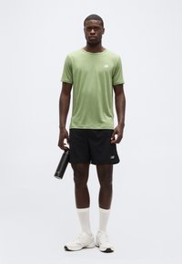 Νεαρός άνδρας που φοράει ένα ανοιχτοπράσινο κοντομάνικο T-shirt New Balance και μαύρο σορτς, στέκεται μπροστά σε μια απλή γκρι φόντο.