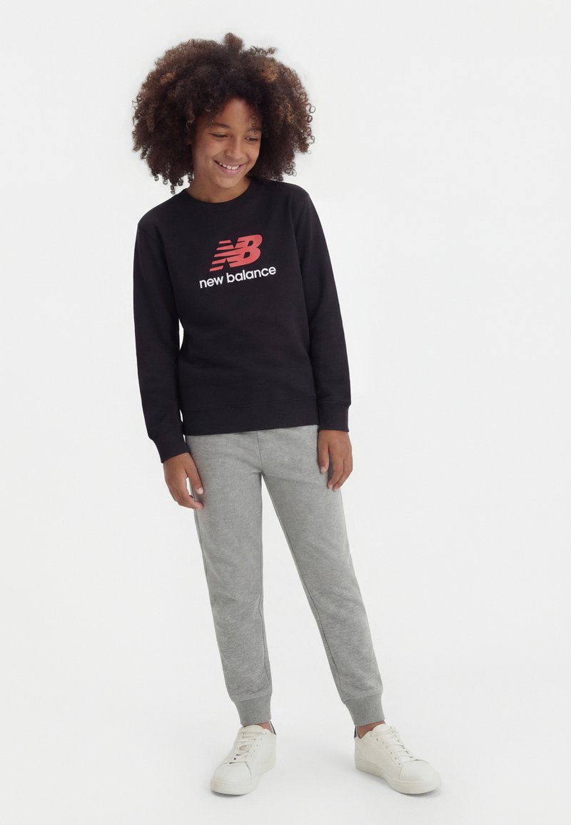 Παιδί με σγουρά μαλλιά που φοράει μαύρο φούτερ New Balance, γκρι φόρμα και λευκά αθλητικά παπούτσια, στέκεται και χαμογελάει σε λευκό φόντο.