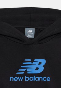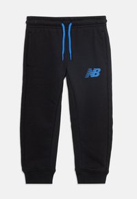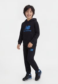 Αγόρι που χαμογελά, φοράει μαύρο φούτερ και παντελόνι New Balance με μπλε λογότυπα, καθώς και μαύρα και μπλε αθλητικά παπούτσια, στέκεται σε λευκό φόντο.