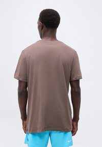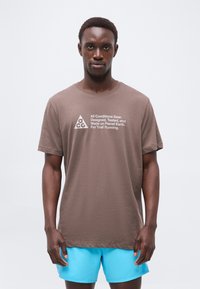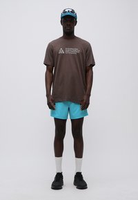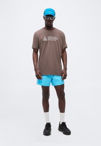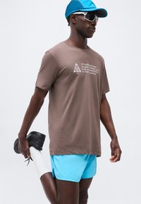 Άνδρας φοράει καφέ μπλούζα με το κείμενο «All Conditions Gear» και μπλε σορτς, στέκεται με το πρόσωπο προς τα εμπρός σε απλό φωτεινό φόντο.