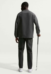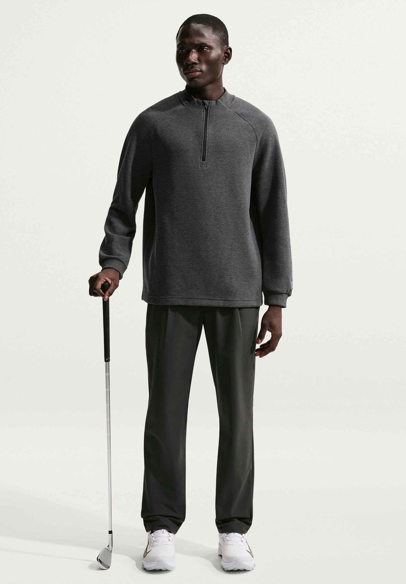 Άνδρας που φοράει σκούρο γκρι πουλόβερ με φερμουάρ μέχρι τη μέση και μαύρο παντελόνι, κρατώντας μια ράβδο γκολφ, στέκεται μπροστά σε απλό φωτεινό φόντο.