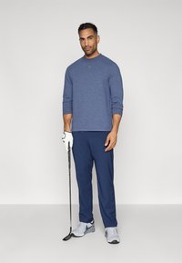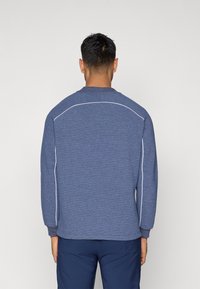 Μπλέ φούτερ με υφή, στρογγυλή λαιμόκοψη και ραμμένο μανίκι. Διαθέτει μικρό λογότυπο στο στήθος. Φορεμένο με ναυτικές παντελόνες.