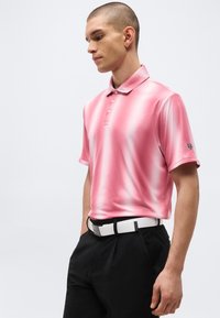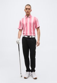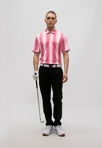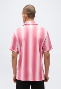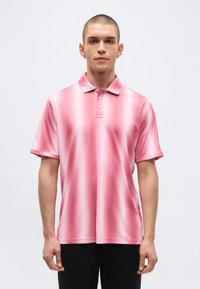 Νεαρός άνδρας με κοντά μαλλιά που φοράει ένα ροζ και άσπρο πολο με κάθετες ρίγες και μαύρο παντελόνι, στέκεται μπροστά σε απλό φόντο.
