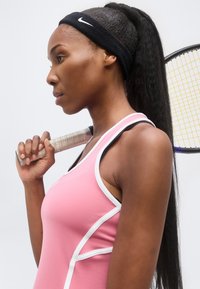 Γυναίκα με μακριά μαλλιά, φορώντας ένα αμάνικο ροζ αθλητικό φόρεμα με λευκή λεπτομέρεια, στέκεται μπροστά σε απλό ανοιχτό φόντο.