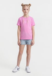 Κορίτσι με διπλούς πλεξούδες σε κότσους φοράει ροζ μπλουζάκι Nike, ανοιχτόχρωμα τζιν σορτς και λευκά αθλητικά παπούτσια Nike, στέκεται μπροστά σε λευκό φόντο.