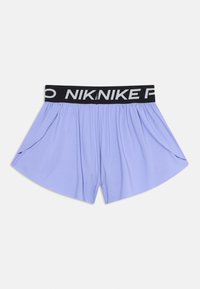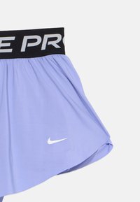 Μωβ σορτς Nike Pro με μαύρη ελαστική ζώνη μέσης που φέρει το λογότυπο "NIKE PRO" σε λευκό. Ελαφρύ ύφασμα, φαρδιά σχεδίαση στα πόδια και λεπτομέρεια με λογότυπο.