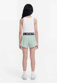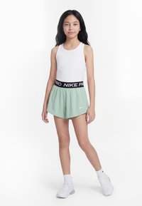 Νεαρή κοπέλα όρθια, φοράει λευκή φανέλα χωρίς μανίκια, ανοιχτοπράσινα σορτς Nike με μαύρη ζώνη μέσης, λευκές κάλτσες και λευκά αθλητικά παπούτσια σε λευκό φόντο.