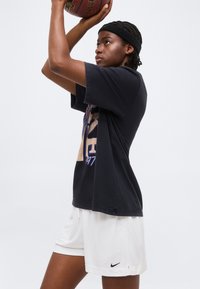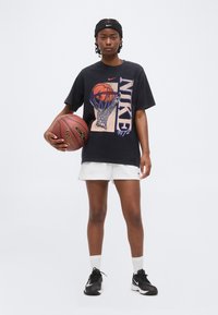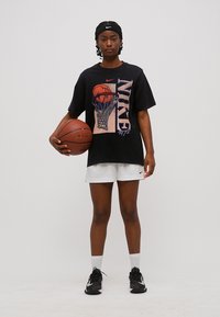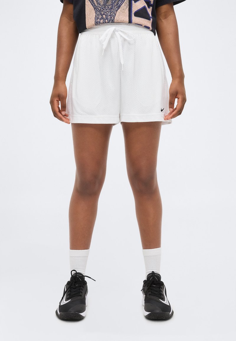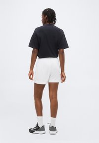 Άτομο που φοράει λευκά σορτς πλέγμα με κορδόνια και μαύρα αθλητικά παπούτσια με λευκές κάλτσες, στέκεται σε απλό φόντο.