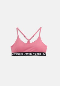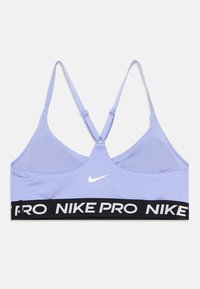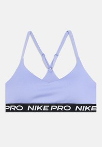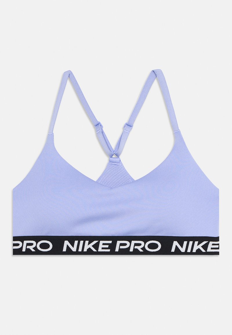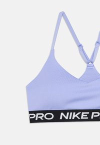 Αθλητικό σουτιέν ανοιχτό μωβ με λεπτές ρυθμιζόμενες τιράντες που σχηματίζουν racerback και μαύρη ελαστική ταινία με λευκό κείμενο «NIKE PRO».