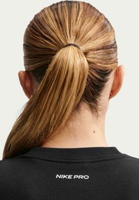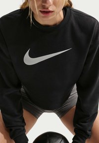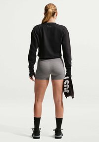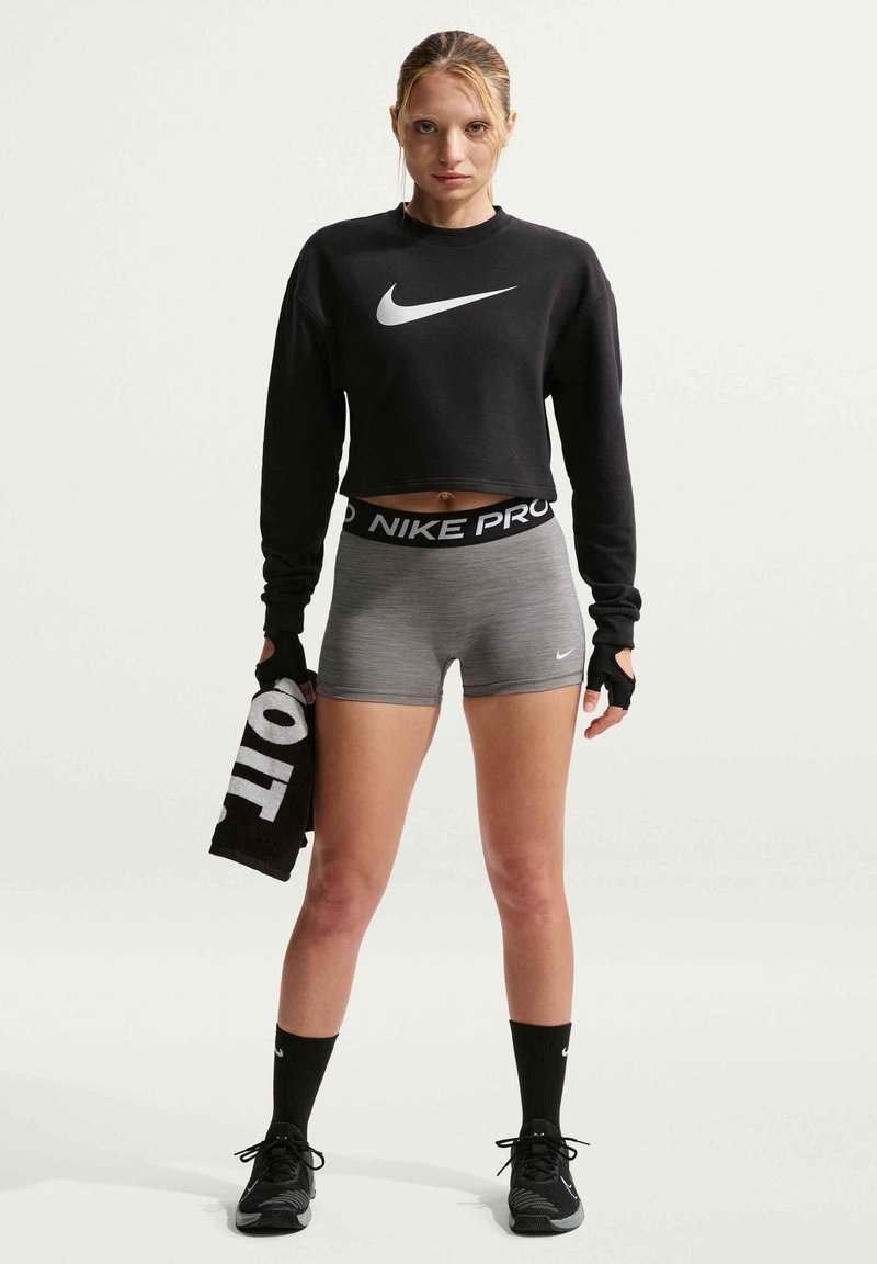 Γυναίκα με μαύρο cropped φούτερ και γκρι σορτς Nike Pro, κρατάει μαύρη πετσέτα, φοράει μαύρα γάντια, κάλτσες και παπούτσια για τρέξιμο, όρθια.