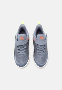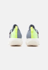 Γκρι και νέον πράσινο αθλητικό παπούτσι με πορτοκαλί λογότυπο σχήματος φτερού, λευκή κυματιστή σόλα, δικτυωτό άνω μέρος και λουράκι με βέλκρο σε απλό φόντο.