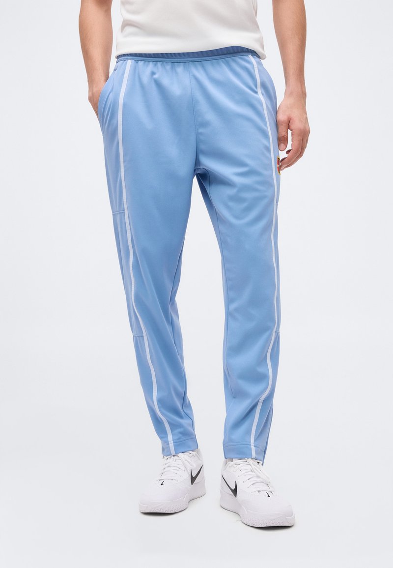 Άνδρας που φοράει ανοιχτό μπλε αθλητικό παντελόνι με λευκές ρίγες στο πλάι και λευκά παπούτσια Nike, με τα χέρια στις τσέπες, στέκεται μπροστά σε απλό φόντο.