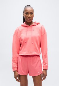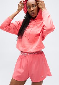 Ροζ cropped φούτερ Nike Pro με κορδόνι και κεντημένο λογότυπο, συνδυασμένο με ταιριαστά ροζ σορτς. Λείο ύφασμα και άνετη εφαρμογή.