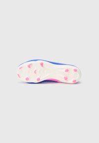 Μπλε ποδοσφαιρικό παπούτσι με υφασμένο συνθετικό επάνω μέρος, λευκό και ροζ σχέδιο σβόλου, και ροζ εξογκώματα πρόσφυσης σε λευκή σόλα.