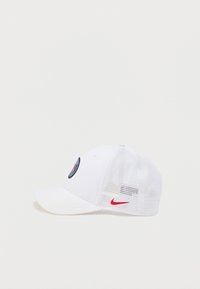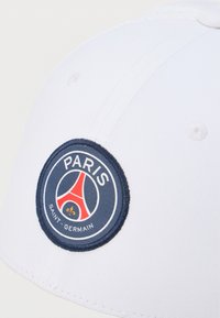 Λευκό καπέλο baseball με κυκλικό λογότυπο της ομάδας Paris Saint-Germain σε σκούρο μπλε και κόκκινο, με κόκκινο σημάδι Nike στο πλάι και πλέγμα στην πίσω πλευρά.