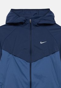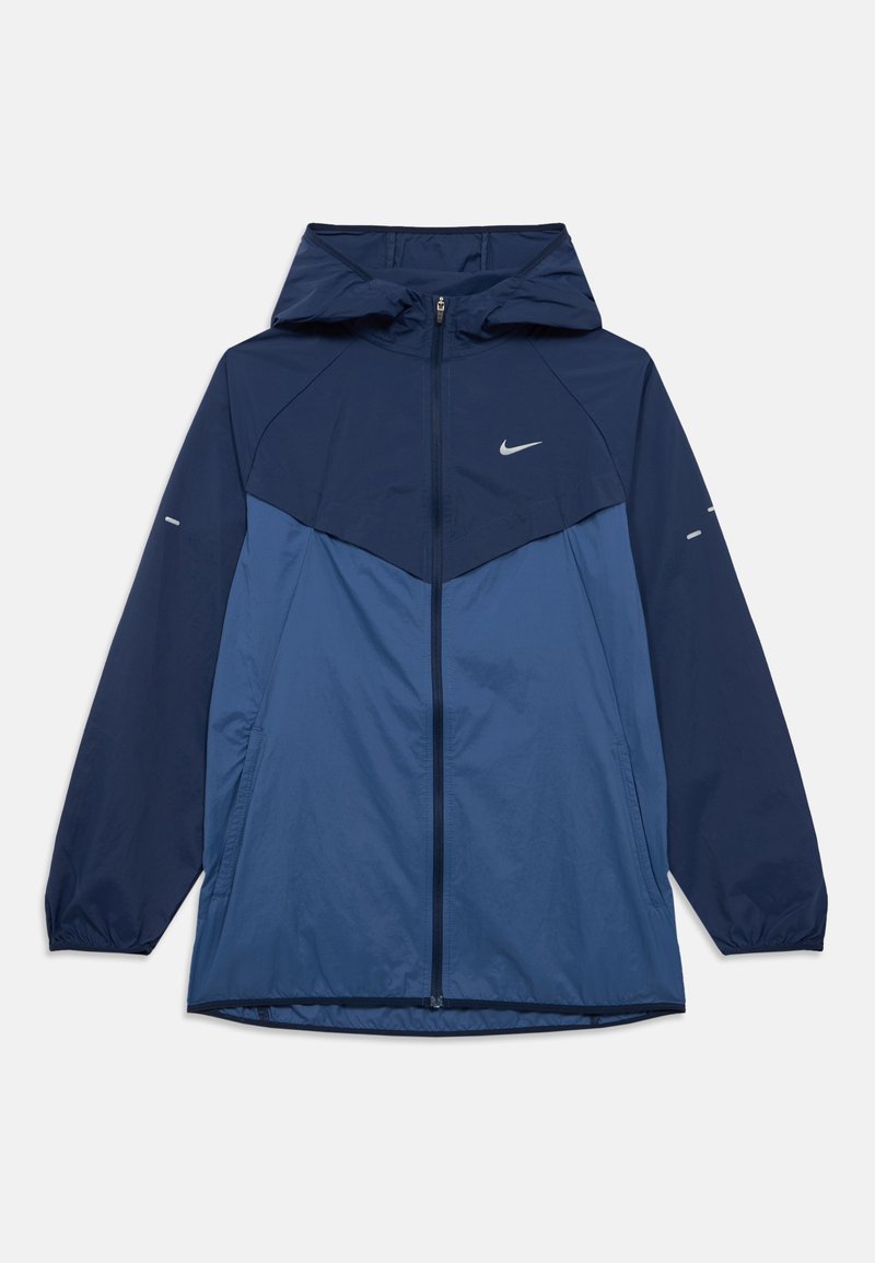 Αντιανεμικό μπουφάν Nike σε σκούρο μπλε και ναυτικό, με φερμουάρ μπροστά, κουκούλα και ανακλαστικές λεπτομέρειες στα μανίκια. Ελαφρύ υλικό με απαλή υφή.