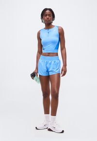 Νεαρή γυναίκα όρθια, φοράει αθλητικό τοπ χωρίς μανίκια σε ανοιχτό γαλάζιο χρώμα και ταιριαστά σορτς, μπροστά σε απλό λευκό φόντο.