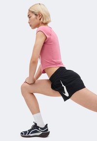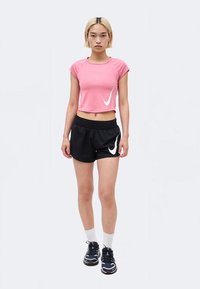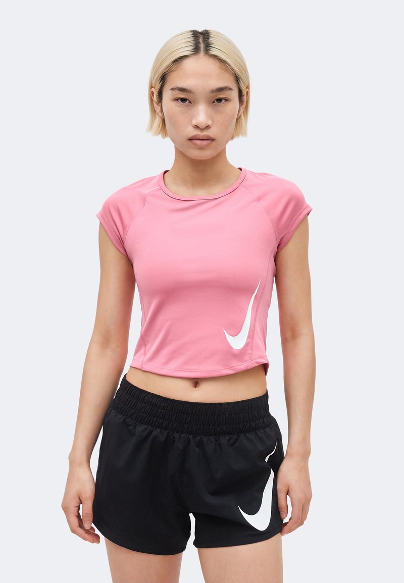 Νεαρή γυναίκα με κοντά ξανθά μαλλιά που φοράει ροζ κομμένο T-shirt Nike και μαύρο αθλητικό σορτς Nike, στέκεται μπροστά σε φωτεινό φόντο.
