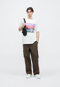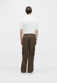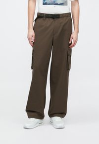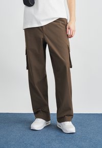 Καφέ παντελόνια cargo με πλαϊνές τσέπες, φτιαγμένα από ελαφρύ ύφασμα, συνδυασμένα με λευκά αθλητικά παπούτσια. Το σκηνικό έχει ανοιχτόχρωμο φόντο και μπλε χαλί.
