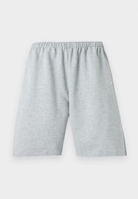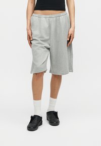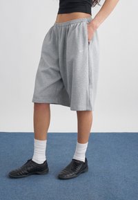 Άτομο που φοράει γκρι κοντά σορτς Nike μέχρι το γόνατο, μαύρα αθλητικά παπούτσια, λευκές κάλτσες και μαύρο κορμάκι, στέκεται σε μπλε χαλί.
