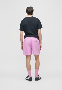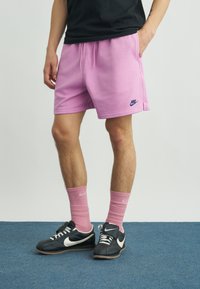 Άνδρας που φοράει ροζ σορτς Nike, ροζ κάλτσες που ταιριάζουν και μαύρα παπούτσια Nike, στέκεται σε μπλε χαλί.